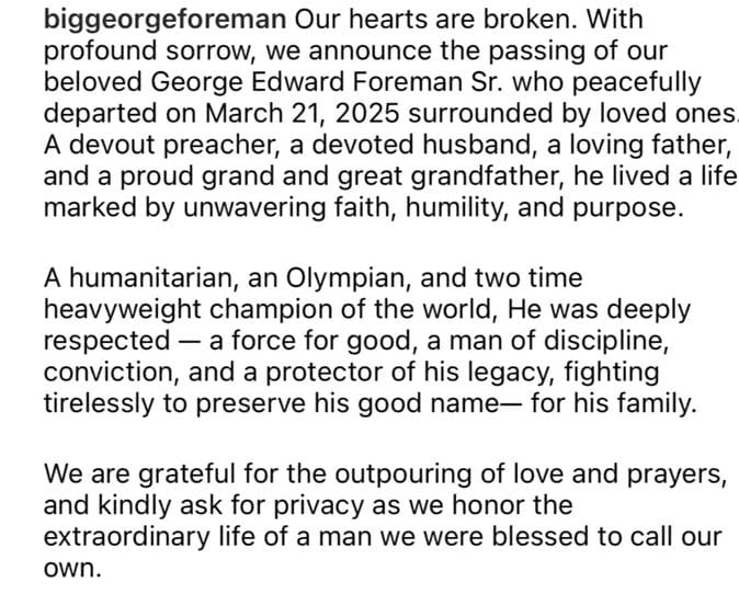 Legendary two-time world heavyweight champion and Olympic gold medalist George Foreman has passed away at the age of 76. His family announced his peaceful passing on March 21, 2025, expressing gratitude for the outpouring of love and prayers while requesting privacy during this difficult time.