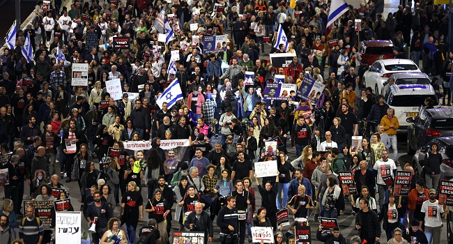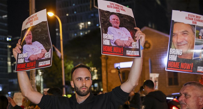 As news of the incident spread late Friday, hundreds of people gathered at Israel’s ministry of defence in Tel Aviv to call on Netanyahu’s government to secure the release of 129 hostages still being held in Hamas-ruled territory.
