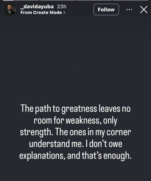 In response, David shared—then deleted—an Instagram post in which he dismissed the public attention, stating that those who truly know him understand his perspective and that he does not owe anyone an explanation.