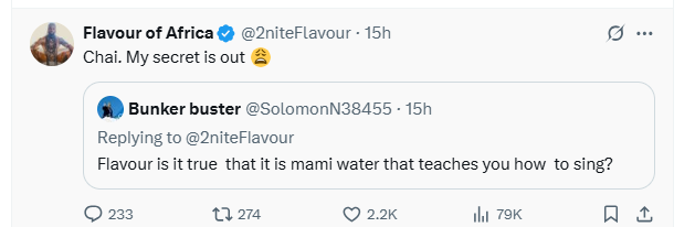 Popular highlife sensation Flavour has sparked laughter across social media after responding to a fan who claimed his exceptional singing talent came from underwater spirits, popularly known as Mami Water.