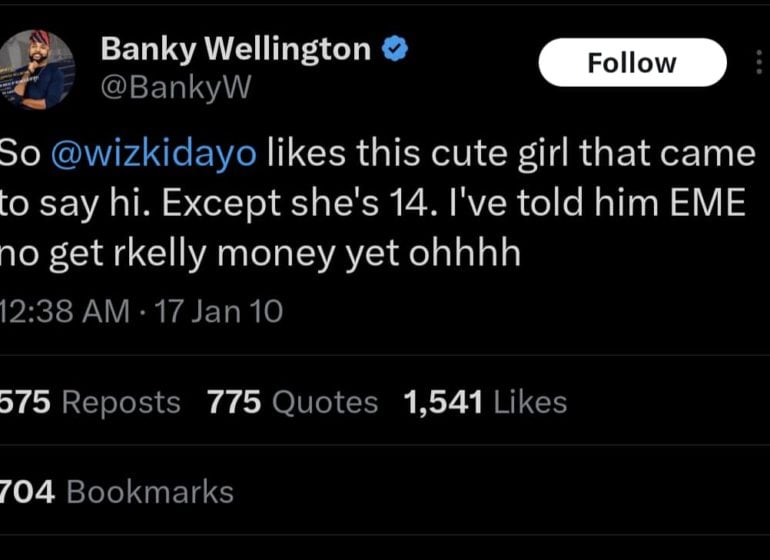 Cautioning his signee, Banky W wrote, So @wizkidayo likes this cute girl that came to say hi. Except she’s 14. I’ve told him EME no get rkelly money yet ohhhh, a clear nod to the R. Kelly child sexual abuse scandal.